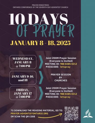 The 10 Days of Prayer, which began on January 8, continues until January 18, 2025, as an individual observance. On Friday January 17, we will be joining the Ontario Conference of the Seventh-day Adventist Church Zoom prayer session, and on January 18 we will have a special celebration during the Sabbath worship experience.