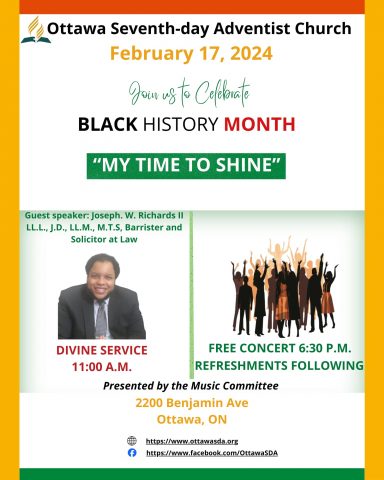 Join us this Sabbath, February 17, 2024, for the Ottawa Seventh-day Adventist Church worship experience. We look forward to seeing you in person and online.