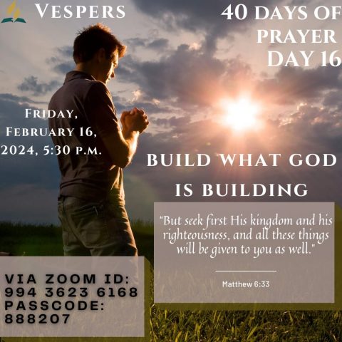 This month's Church Family Friday Night Vespers will be combined with the 40 Days of Prayer. Join us via Zoom/teleconference for a time of praise, worship, and spiritual nourishment as we fellowship as one.