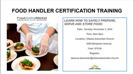 Learn how to safely prepare, serve and store food according to the latest public health standards. This training may be of particular interest to those who are serving or who wish to serve in community, church or other public settings. Join us from 9:00 a.m. to 5:00 p.m. for in-person training at 2200 Benjamin Avenue. Cost $70. To register, contact deanna.alexander@ottawadventist.church.