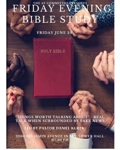 Join us this evening Friday, June 24 at 2200 Benjamin Avenue, in the Lower Hall, at 7:30 pm as we discuss "Things Worth Talking About" - real talk when surrounded by fake news!