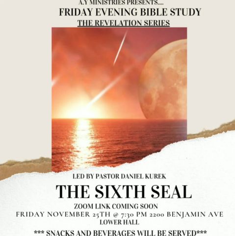 Join us this Friday November 25th at 2200 Benjamin Avenue in the lower hall for the sixth part of our riveting revelation bible study series. We will discuss the sixth seal!