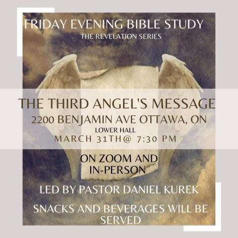 Join us this Friday March 31, 2023, at 2200 Benjamin Avenue in the lower hall. This will be a riveting Bible study where we will learn about the the third angel's message. Start the Sabbath with us in the word!