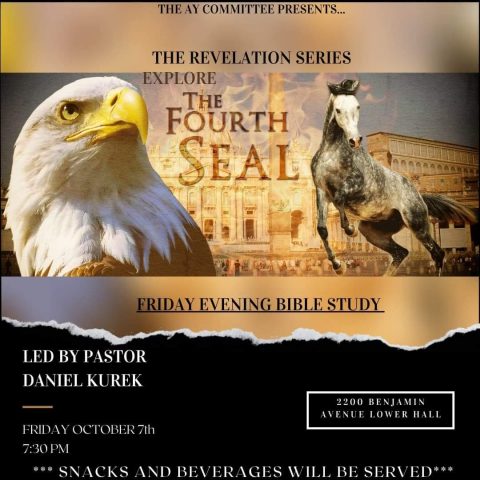 Join us this Friday, October 7 at 7:30 PM at 2200 Benjamin Avenue in the lower hall for the fourth part of our riveting revelation Bible Study series. We will discuss the Fourth Seal!