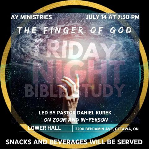 Join us this evening Friday July 14th at 7:30 pm at 2200 Benjamin Avenue in the lower hall. This will be a riveting Bible study where we will discuss the finger of God also known as the Holy Spirit! Start the Sabbath off right with us in the word!