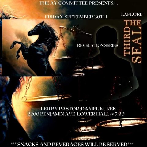 Join us this Friday, September 30, at 2200 Benjamin Avenue, at 7:30PM, in the lower hall, for the third part of our riveting Revelation Bible Study series.