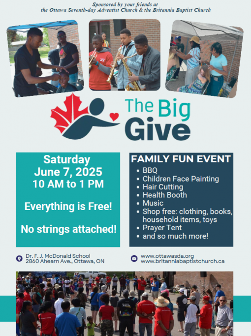 The Ottawa Adventist Church is once again joining this nationwide movement of generosity - Big Give. This Saturday, our incredible volunteers will be on-site at 2860 Ahearn Avenue, providing services to the community and distributing donated items. Thank you for your support/contribution to this inspiring event that turns compassion into action and transforms lives!