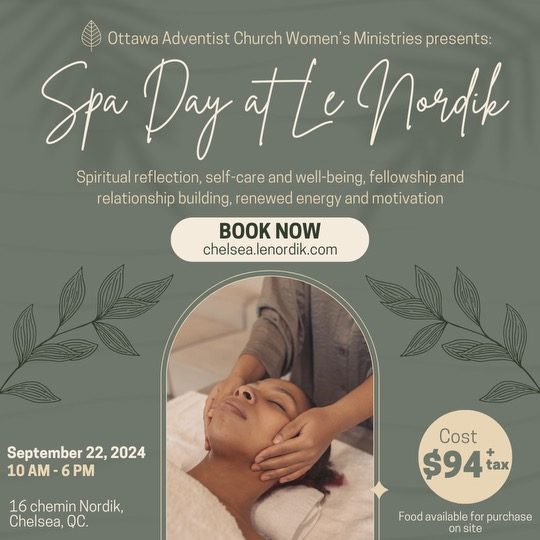 Ladies, the Ottawa Adventist Church Women’s Ministries invites you to a day of self-care, spiritual reflection, and fellowship at Nordik Spa on Sunday, September 22, from 10:00 a.m. to 6:00 p.m. Admission is $94 + tax and includes your bathrobe, towel, and locker rental. We recommend you bring a water bottle, bathing suit, and sandals. Food is available for purchase onsite.