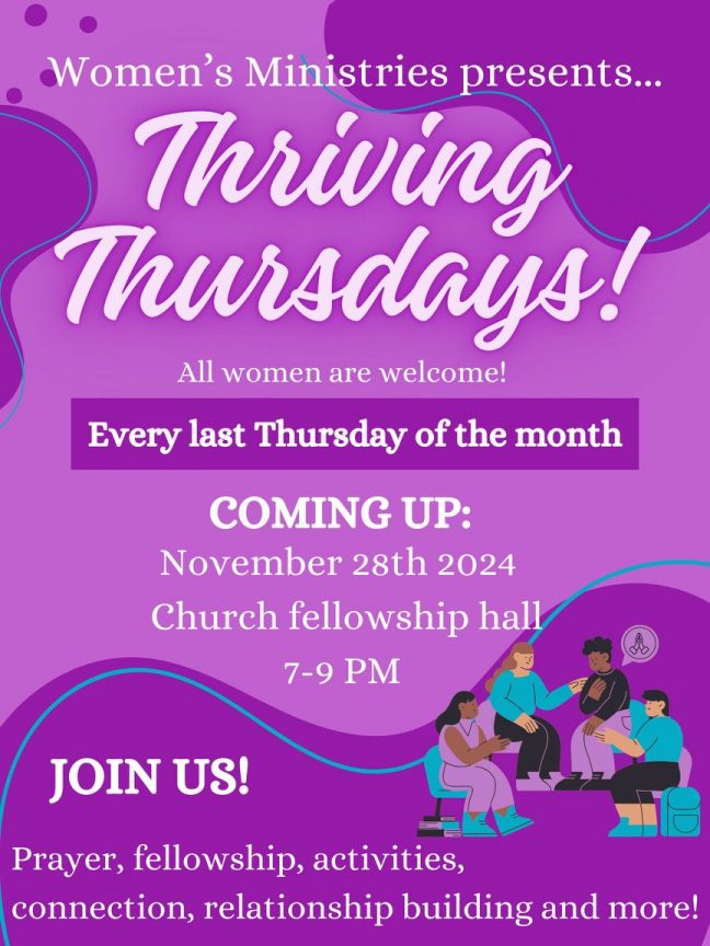 Calling all women to join us for Women’s Ministries “Thriving Thursdays” in the church’s lower hall from 7:00 p.m. to brainstorm on a spring 2025 retreat. We need your ideas for selecting the activities, venue, themes, and much more. Women’s Ministries does not want to plan without YOU!